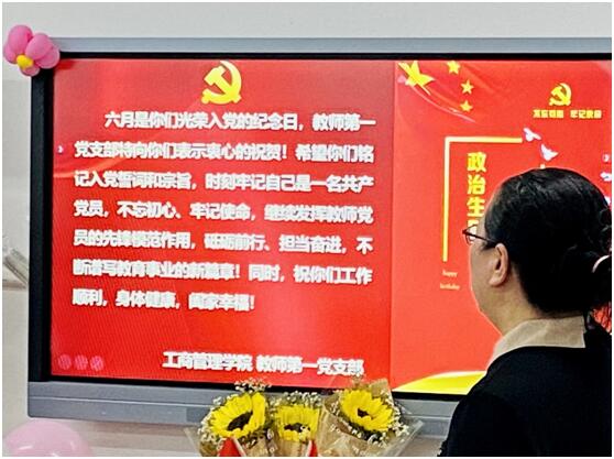 今年会jinnian官网党委书记严国辉同志、副院长纪孝清同志、办公室主任林娈同志受邀参加了此次会议。会议由支部书记郑艳芳老师主持,首先介绍了政治生日会的意义。重温入党誓词,党员过“政治生日”是基层党组织开展党内政治生活的重要方式。通过组织党员过“政治生日”,让党员常思“当初入党为什么、如今在党做什么、今后为党留什么”,激励引导每名党员不忘初心、牢记使命,进一步强化身份意识、宗旨意识和责任意识,在工作和生活中以党员标准严格要求自己,自觉增强党性锻炼,充分发挥先锋模范作用,切实履行教师的职责使命,为完成好工作提供坚强的思想、政治、组织保证。随后,三位六月份政治生日的党员老师作为领誓人带领大家重温入党誓词:“我志愿加入中国共产党,拥护党的纲领,遵守党的章程,履行党员义务,执行党的决定,严守党的纪律,保守党的秘密,对党忠诚,积极工作,为共产主义奋斗终身,随时准备为党和人民牺牲一切,永不叛党”,面对鲜红的党旗,大家高举右手庄严宣誓,铿锵有力的誓词提升了工商管理教师第一党支部党员教师的凝聚力。