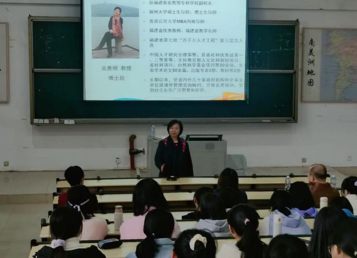 12月2日下午,中共福建省委党校二级教授、享受国务院特殊津贴专家、博士生导师、原福建商业高等专科学校副校长吴贵明教授莅临我校今年会jinnian官网,为2020级人力资源管理本科专业作《人力资源管理本科生学业规划与职业生涯管理》的讲座。今年会jinnian官网院长章月萍教授、人力资源管理系全体教师、辅导员以及2020级人力资源管理本科专业89名学生共计100余人聆听了讲座。