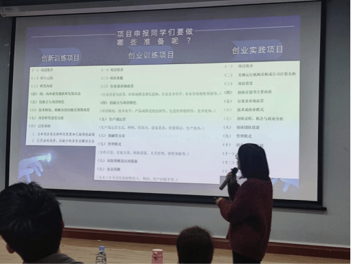 陈晓霞老师长期致力于指导大学生创新创业大赛,用自身丰富的指导竞赛经验为学生们详细讲解了如何选取创新创业目标、如何撰写项目策划书等申报过程中各环节的技巧。陈老师用大量的实际案例激励了同学们对参与本次比赛的热情。在讲座的最后,老师还热情地与参会的同学交流互动并积极回答同学们对创新创业比赛存在的疑惑和问题,让在座的同学都受益匪浅。