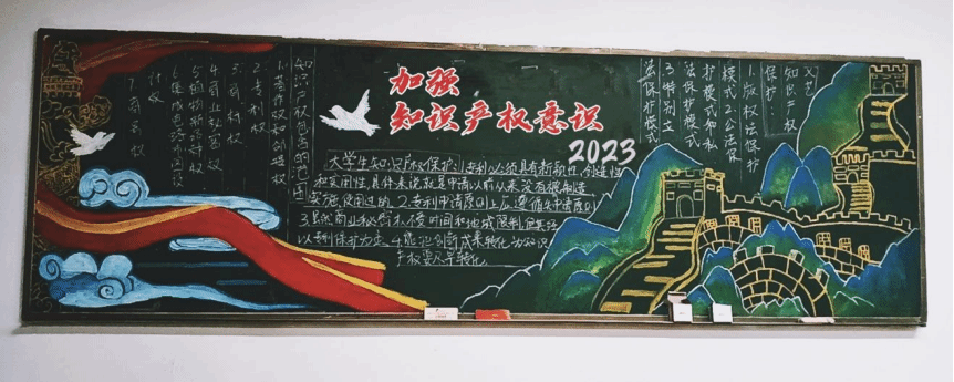 首先,在4月23日班导师带领2021级零售业管理专业的学生设计并绘制知识产权宣传主题黑板报。黑板报围绕着“知识产权的范围”、“大学生创业过程中的知识产权保”以及“歌曲文艺作品中的知识产权保护”三大主题内容向大学生介绍学生们感兴趣并在学习与生活中常用场景下的知识产权相关法律法规及科普知识。通过学生们自发讨论主题、自行搜索资料到策划黑板报构图并图文并茂地呈现出黑板报,绘制过程中,学生们对于知识产权的了解不断加深,也树立了一定的“尊重知识、崇尚创新、诚信守法、公平竞争”的知识产权文化意识。