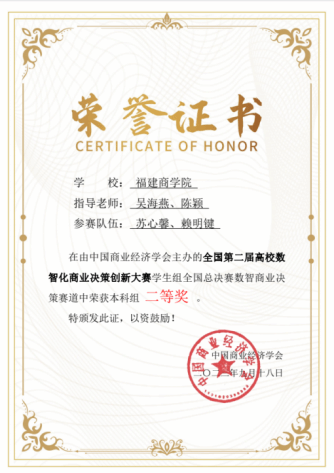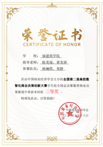 在学生组全国总决赛数智商业决策赛道中,由吴海燕、陈颖老师指导的苏心馨和赖明键团队获得二等奖,由陈美端、黄美娇老师指导的杨斓煜和郑静团队获得三等奖。这次比赛让学生们深刻认识到数智化给商业决策带来的巨大变化,不仅锻炼了商业决策能力,也进一步提升了创新思维。