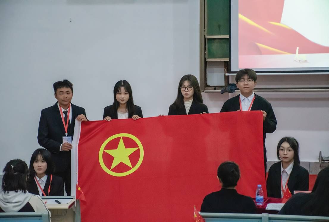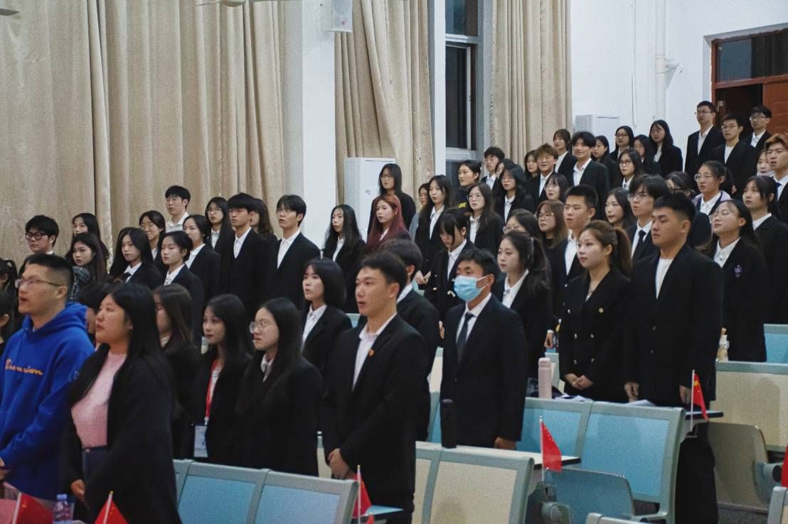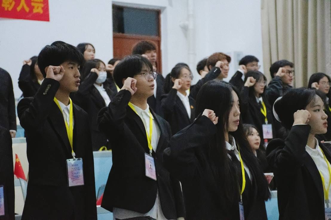奋斗正当时,接力新征程。新老干部交接团旗,顺利完成使命的交接。由团委学生副书记叶思涵带领全体新一届学生干部面向团旗庄严宣誓。