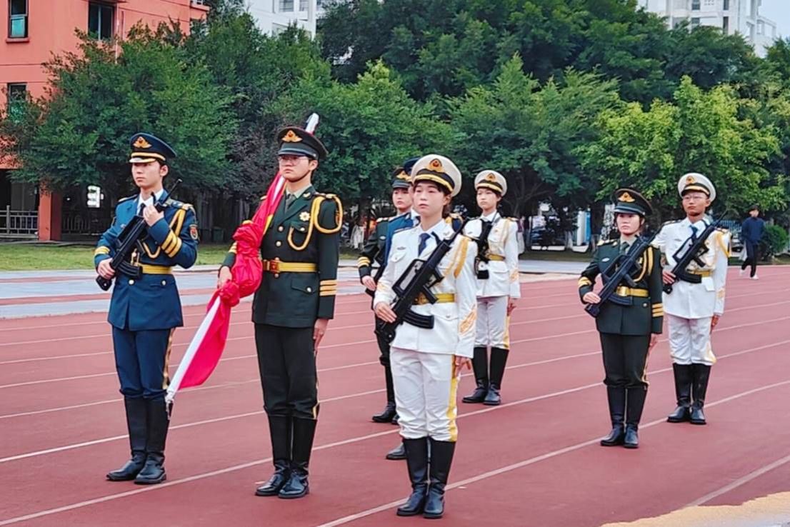 迎着初升太阳的光辉,伴着国旗护卫队铿锵的步伐和洪亮的口号,升旗仪式准时拉开帷幕。在庄严肃穆的氛围中,五星红旗在洪亮的歌声中冉冉升起。