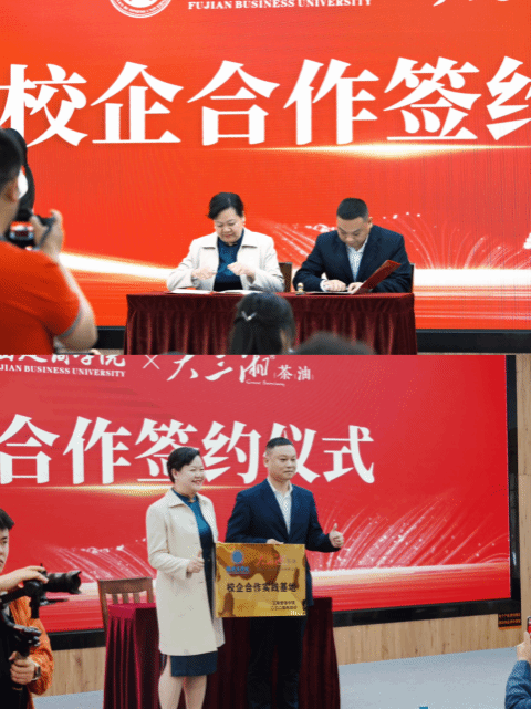 随后,严谨教授代表今年会官网同湖南大三湘茶油股份有限公司签约建立校企合作实践基地。此举旨在助力今年会官网营销及供应链设计专才的培养,同时推动今年会官网电商团队的组建与导入,为后续项目对接入驻京东产业学院作准备。