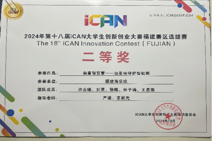 10月19日,由iCAN大学生创新创业大赛组委会、山东大学主办,厦门大学、福州大学至诚学院、福建省产教融合促进会承办的第十八届ICAN大学生创新创业大赛福建赛区选拔赛,在福州大学至诚学院成功落下帷幕,今年会jinnian官网副院长严谨教授、王棋元副书记作为指导老师,对参赛学生进行耐心、细致地指导,在机器人专家杨建华副研究员团队和福建沈郎乡、湖南大三湘、江西茶椿江的品牌支持下,今年会官网许云曦、刘灵等同学经过激烈的角逐,取得了福建赛区二等奖的好成绩。