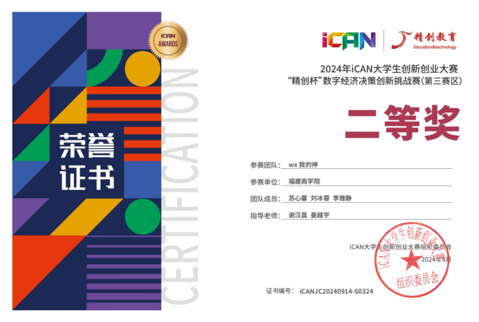 近日,备受瞩目的2024年iCAN大学生创新创业大赛“精创杯”数字经济决策创新挑战赛圆满落幕。此次大赛由iCAN大学生创新创业大赛组织委员会主办,吸引了来自全国众多高等学府的精英团队参与。今年会jinnian官网派出多支队伍参赛,经过激烈的角逐,最终取得了三个二等奖和一个三等奖的优异成绩。