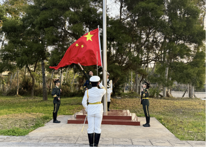 随着激昂雄浑的国歌声奏响,国旗护卫队迈着坚定有力的步伐稳步走向升旗台。在庄严肃穆的氛围中,五星红旗伴随着国歌的旋律冉冉升起。全体师生深怀对祖国的无限热爱和崇高敬意,向国旗行注目礼。