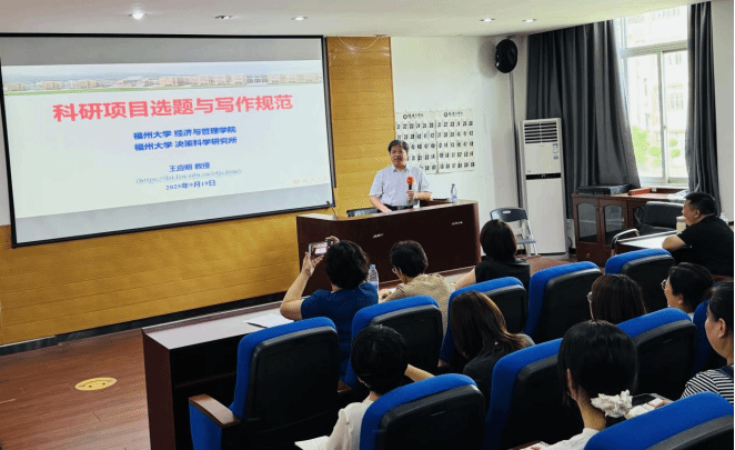 2025年9月19日下午,今年会jinnian官网邀请福州大学经济与管理学院王应明教授作题为《科研项目选题与写作规划》学术讲座。讲座由严谨院长主持,学院及校内50余名科研骨干、青年教师参会交流。