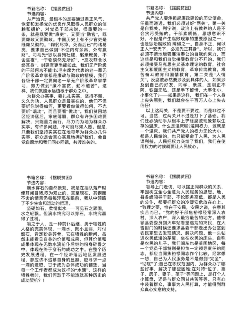 本次活动同学们通过填写活动报名表报名,根据线上诵读打卡活动群所分享的朗诵内容,在微信“小打卡”小程序上进行为期14天的阅读打卡。本期阅读打卡活动主要围绕《摆脱贫困》一书展开学习与讨论,引领广大同学深刻体会本书中所蕴含的重要理念、宝贵经验、优良作风。参与此次活动的同学们纷纷表示,要把学习《摆脱贫困》这本书与学思践悟习近平新时代中国特色社会主义思想有机结合起来,不断从中汲取智慧和力量,奋力谱写全面建设社会主义现代化国家新篇章。