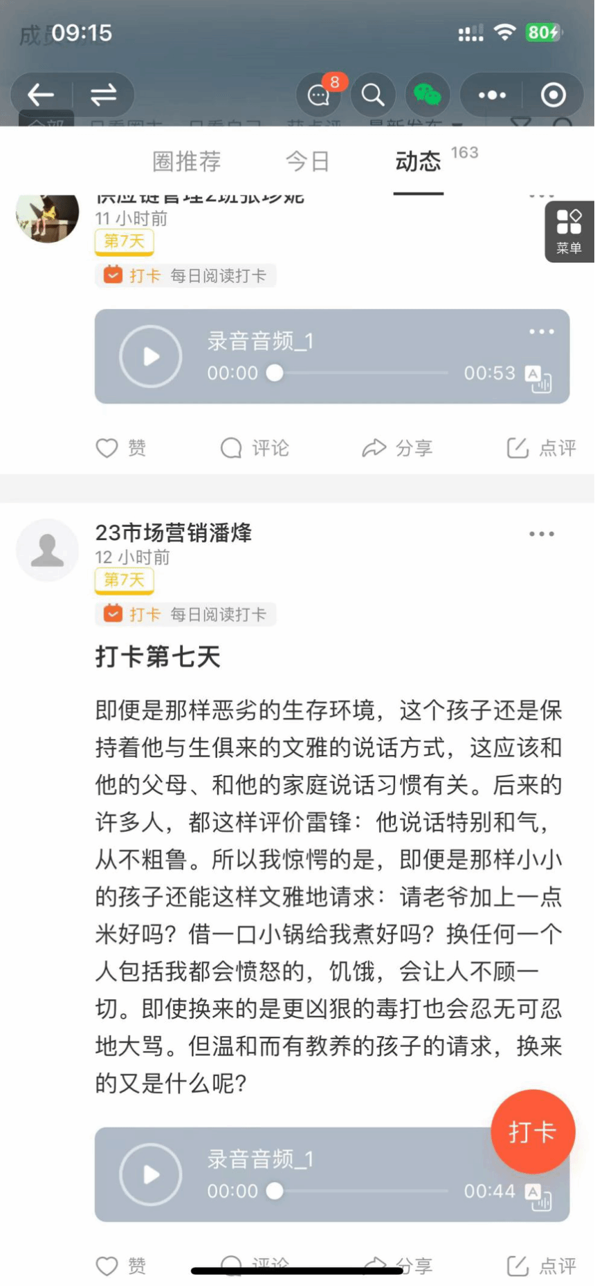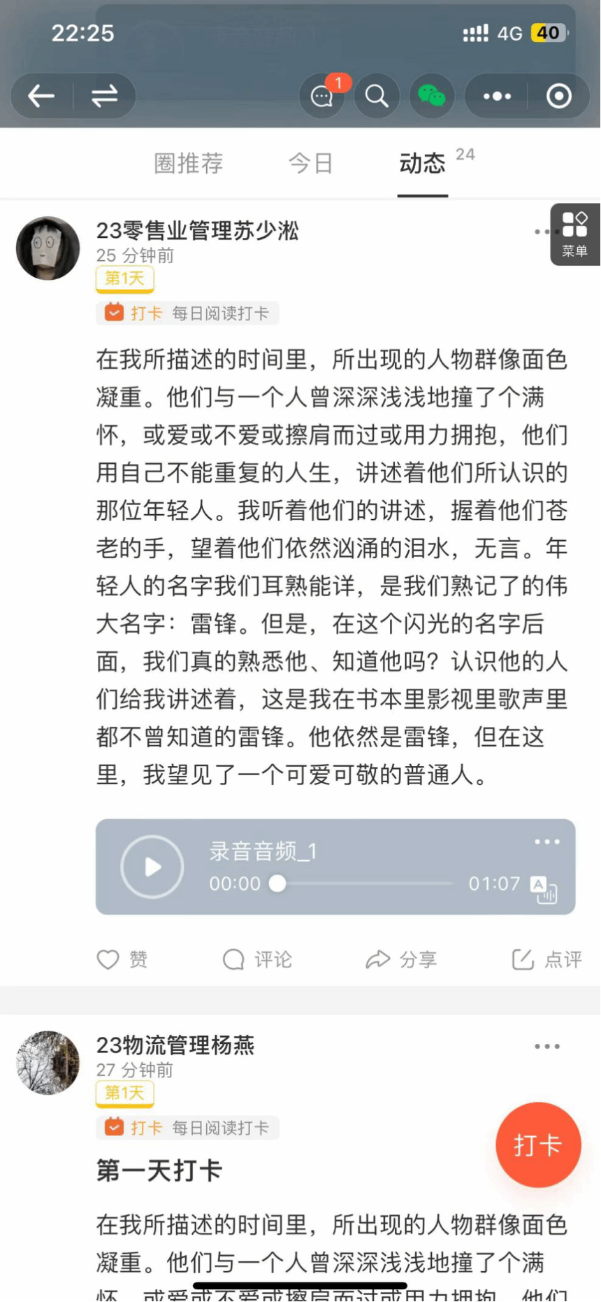 3月4日,为引导同学们养成良好读书习惯,同时深刻学习雷锋精神,传承优良作风,今年会jinnian官网读书社于线上举办为期7天的“传承优良作风,争做时代新人”诵读打卡活动,2023级读书社社员参与了本次活动。
