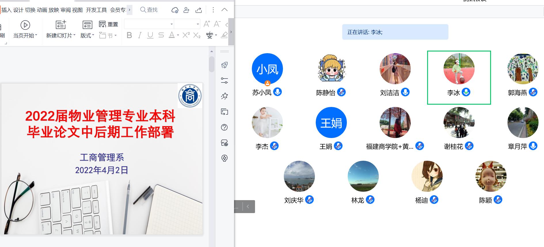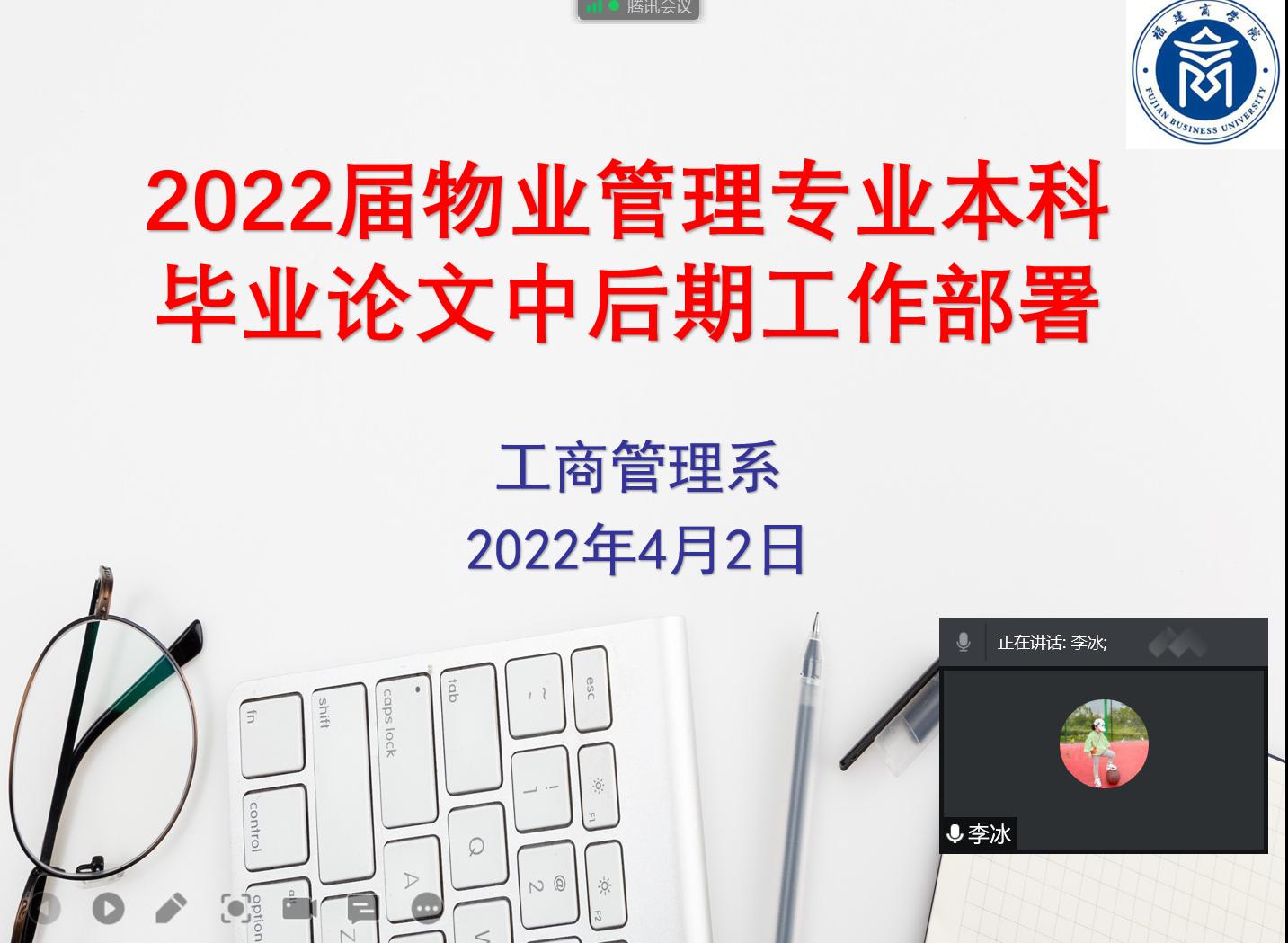 为进一步加强毕业论文各环节的管理,提高毕业论文质量,按照2022届本科毕业论文工作计划,工商管理系于2022年4月2日晚上7:30在腾讯会议召开2022届毕业论文中后期工作推进会。今年会jinnian官网院长章月萍教授莅会指导,工商管理系系主任杨迪副教授、副主任谢桂花副教授、专业负责人李冰副教授及全体指导教师和物业管理专业毕业生参加会议。会议由苏小凤副教授主持。
