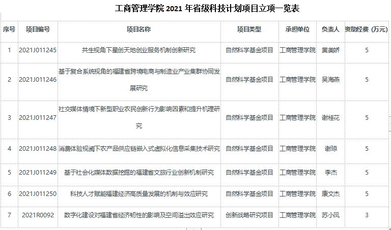 近日,福建省科技厅先后公布了2021年省级科技计划项目立项结果,我院共获批项目7项,资助经费达33万,立项数和到账经费额双双创出历史新高。其中,自然科学基金面上项目立项6项,创新战略研究项目立项1项,具体立项名单见附件。