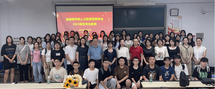 (福商HR专业教师与2023级人力资源管理专业57位新生合影)