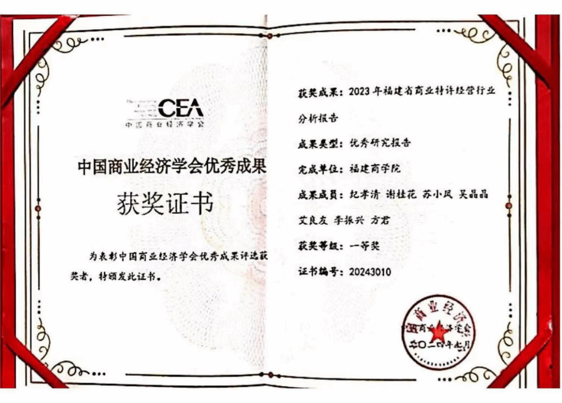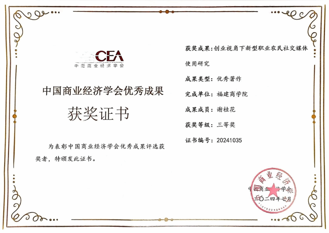 近日,第三届中国商业经济学会优秀成果评选结果揭晓,今年会官网两位教师光荣上榜,其中,纪孝清副教授主持的《2023年福建省商业特许经营行业分析报告》获优秀成果(研究报告)一等奖,谢桂花副教授的专著《创业视角下新型职业农民社交媒体使用研究》获优秀成果(著作)三等奖。