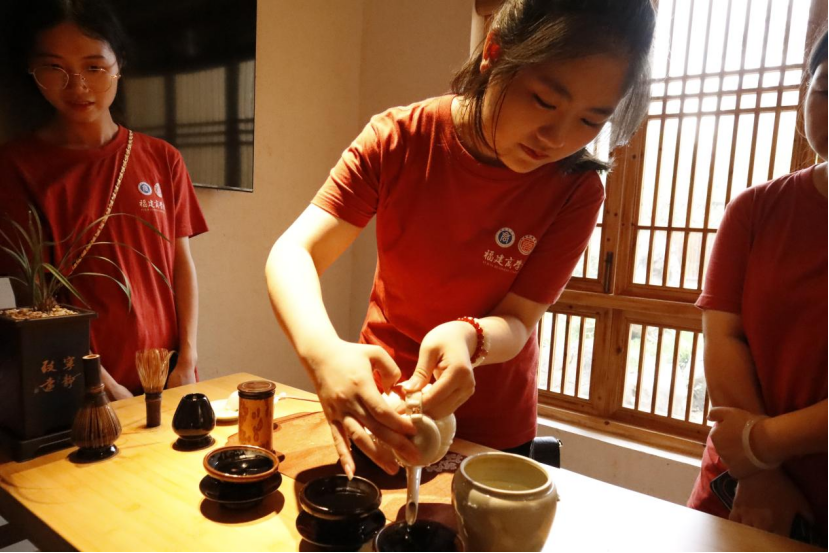 下午,实践队继续出发前往北苑贡茶公园。工作人员为我们详细介绍了北苑贡茶的起源、兴起和由来,讲到了北苑贡茶的规制之高、发展之盛。实践队在工作人员的带领下亲身体验了经《梦华录》刘亦菲点茶片段而风靡一时的宋代点茶整个过程。理论与实践相结合,让大家对点茶有了更加深刻的了解。最后,实践队前往小桥镇甘源茶山进行参观,甘源茶山一直是建瓯小桥一张重要的名片,小桥镇致力于建设“1+3”产业,“1”是指一小时步行圈,即不断延伸茶山步道,让大家能够做到一小时绕行一圈,“3”是指三小时品茗圈,茶山设有专门的共享茶室供大家泡茶使用。