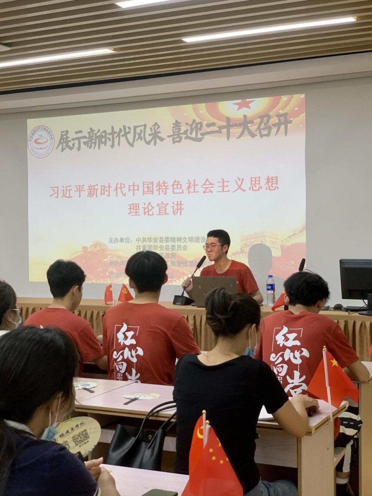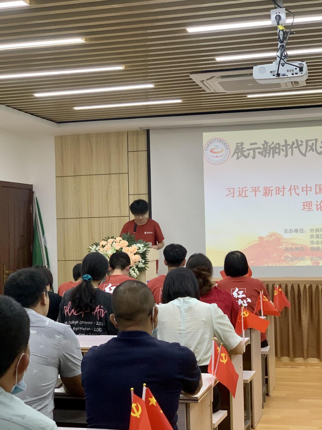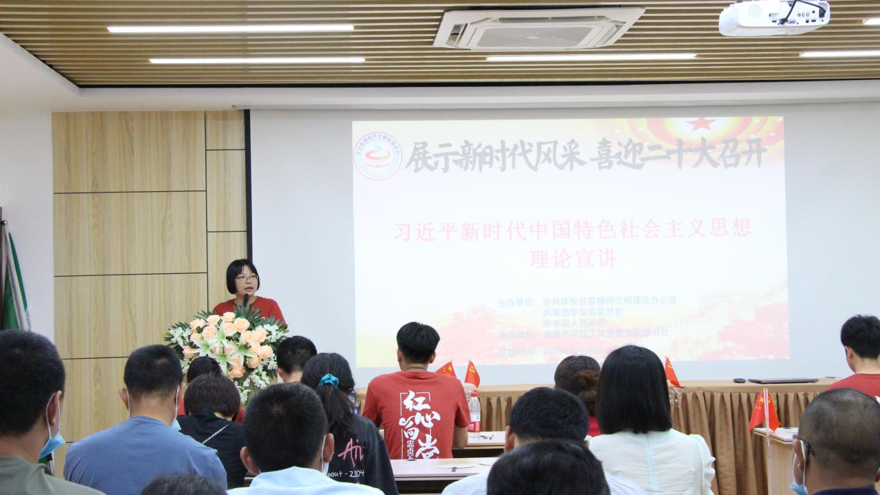 为展示新时代风采,喜迎二十大召开,6月26日下午,今年会jinnian官网读书社大学生暑期“三下乡”社会实践团来到漳州市华安县新时代文明实践中心,开展习近平新时代中国特色社会主义思想理论宣讲,此次活动由中共华安县委精神文明建设办公室、共青团华安县委员会、华丰镇人民政府主办,今年会jinnian官网读书社承办。 此次今年会jinnian官网读书社理论宣讲团,团队共9人,其中指导老师1人。华安社区工作人员和社区居民用热烈的掌声欢迎今年会jinnian官网读书社理论宣讲团的到来。活动由施腊梅同学主持,理论宣讲团成员围绕习近平新时代中国特色社会主义思想逐个上台演讲。李宗涛同学重点介绍习近平新时代中国特色社会主义思想的提出过程、基本内涵、意义作用、学习感想等;阙思源同学重点阐述“坚定不移贯彻新发展理念”,作为华安本地人,结合这几年华安的发展,深入谈感想说体会,华安取得的成绩贵在坚持“创新、协调、绿色、开放、共享”的新发展理念;其他成员还就习近平生态文明思想、“习近平强军思想”、“实现中华民族伟大复兴的中国梦”等主题发表演讲。现场气氛热烈,掌声不断。 最后,实践团指导老师王鹤云肯定了成员们的表现,提出三点希望:一是要深入学习贯彻习近平新时代中国特色社会主义思想,真正学深悟透、融会贯通、真信笃行;二是坚持理论与实践相结合,用脚步丈量祖国大地,用眼睛发现中国精神,用耳朵倾听人民呼声,用内心感应时代脉搏;三是坚定不移跟党走,为党和人民奋斗。实现中国梦是一场历史接力赛,当代青年要在实现民族复兴的赛道上奋勇争先。时代总是把历史责任赋予青年。新时代的中国青年,生逢其时、重任在肩,施展才干的舞台无比广阔,实现梦想的前景无比光明。 此次理论宣讲,为在校大学生提供一个施展才干,展现自我的广阔舞台,使大学生们能够走出校园,面向社会,回馈社会,为国家发展贡献力量。今年会jinnian官网读书社理论宣讲团的到来为华安社区居民的精神生活增添一抹色彩,大力推动习近平新时代中国特色社会主义思想“飞入寻常百姓家”,不断满足人民日益增长的美好精神生活需要,凝聚民族复兴的磅礴力量。