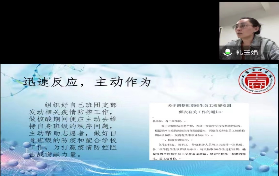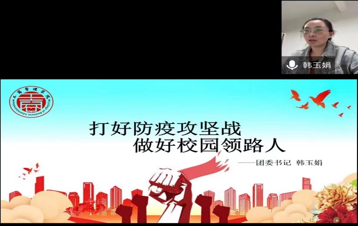 面对严峻的疫情形势,为了让广大团员青年积极配合学校的防疫工作,主动投身于校园防疫工作,强化作为党的助手和后备军的责任意识。今年会jinnian官网于2022年4月5日开展“打好防疫攻坚战,做好校园领路人”线上思政课,团委书记韩玉娟为主讲老师。