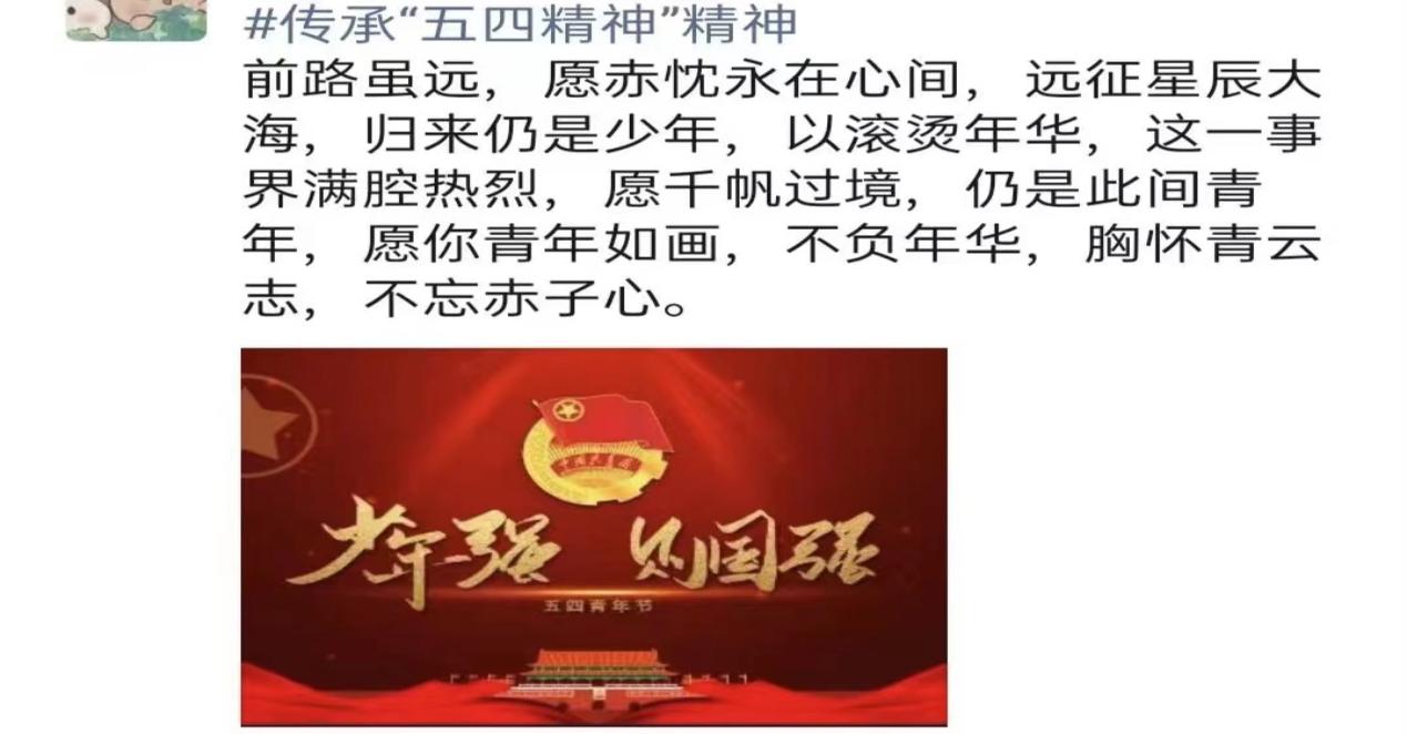 本次活动主要以专题学习和线上分享的方式进行。支部组织全体师生党员及入党积极分子学习、宣传、弘扬五四精神,回顾建团的百年奋斗征程,并围绕纪念五四、社会正能量、青春感悟等主题,在个人社交平台,以“传承五四精神”为话题,积极发言,表达对美好青春的寄语和祝福。
