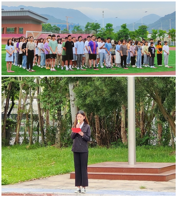 上午7点15分,各班学生有序站立,国旗护卫队成员迈着铿锵有力的步伐护送国旗入场。伴随着庄严嘹亮的国歌,五星红旗冉冉升起,全体学生凝视着迎风飘扬的五星红旗,心中满是对党和国家的敬佩。随后,学生会副主席蔡丹妮同学发表国旗下讲话,她引用神舟十二号载人飞船发射成功的故事,回顾中国载人航天之路,使同学们深切感受前辈们的不易和新中国的航天事业的筚路蓝褛。而身为大学生的我们要认真学习党史,并常学常新,时时将学习成果内化为理想信念,转化为奋进新时代的强劲力量,同学们要勇立潮头,不负时代赋予的使命担当,做中国特色社会主义事业的建设者和接班人。