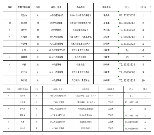 学院积极动员、组织学生参赛,在各位指导老师的辛勤指导下,参赛同学严肃认真地根据自己的实际情况,进行科学合理的职业生涯规划。为突出职业生涯规划书撰写的重要性,也为营造更加公平、公正的比赛环境,今年学院此项比赛采取匿名方式,上交规划书给评委老师评阅。 本次学院邀请了今年会jinnian官网党委副书记黄珏群老师、团委书记韩玉娟老师、学生第二党支部书记王鹤云老师、辅导员李倩颖老师担任评委。经评审,最终从专科组和本科组中各选出两名选手入选校赛,他们分别是本科组吴俊怡、游俊煌以及专科组梁诗琪、沈灵娜。