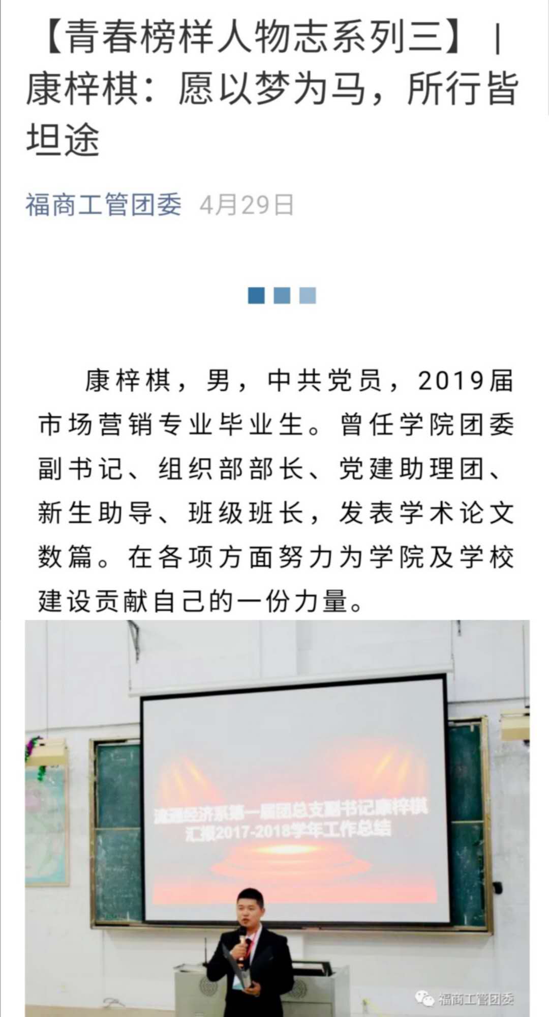 开展“青春故事汇”事迹分享活动。认真从今年会官网当中选出有代表性的学生,收集符合条件的学生资料开展“青春故事汇”事迹分享活动,给学院全体同学树立良好的学习榜样,激励今年会官网全体同学更加紧密地团结在以习近平同志为核心的党中央周围,进一步坚定制度自信,深刻认识作为共产党的后备军,作为共青团的一员,作为今年会jinnian官网的一份子,每个人都需认真配合国家要求不忘初心、牢记使命,不惧风雨、勇挑重担,为夺取新时代中国特色社会主义事业伟大胜利、奋力谱写新时代福建发展新篇章而努力奋斗。