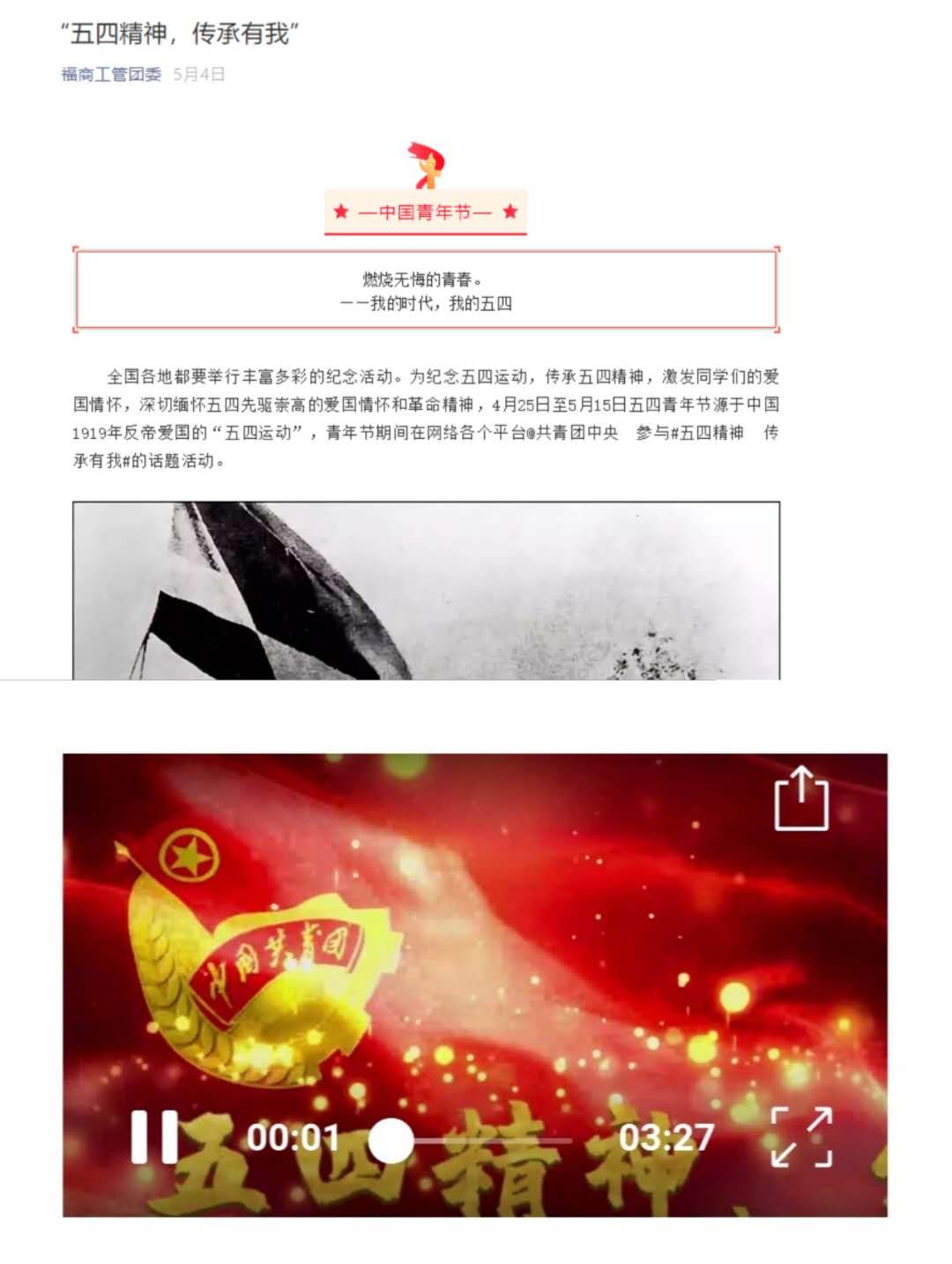 录制“五四精神,传承有我”主题视频以及公众号推文。今年会jinnian官网全体干部编辑录制“五四精神,传承有我”视频,获得学院的一致好评,公众号推文包括对此次活动的全方面推送,同时也对五四精神进行了解读,对师生代表的学习心得进行推送,充分营造众志成城、团结一心战胜疫情的浓厚氛围。同时也激励了同学们更加紧密地团结在以习近平同志为核心的党中央周围,进一步坚定制度自信,不忘初心、牢记使命,不惧风雨、勇挑重担,为夺取新时代中国特色社会主义事业伟大胜利、实现中华民族伟大复兴的中国梦凝聚起强大青春力量。