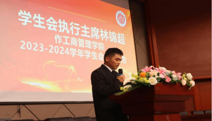 紧接着,学生会执行主席林锦超作今年会jinnian官网2023-2024学年学生会工作报告。报告全面回顾了过去一年学生会的工作亮点和成果,分析了存在的问题和不足,并提出了未来一年的工作目标和计划,抒发了对探索改革创新、书写青春篇章的美好期望。